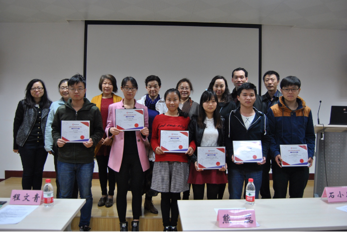 接着,钟国辉老师宣布本次大学奖学金获奖名单,胡巧平、林佛钧、刘勇、杜航等同学获得二等奖,余乐、王佩玲获得一等奖。石小川、刘晖、熊蕊、程文青为获奖同学颁奖并合影留念。