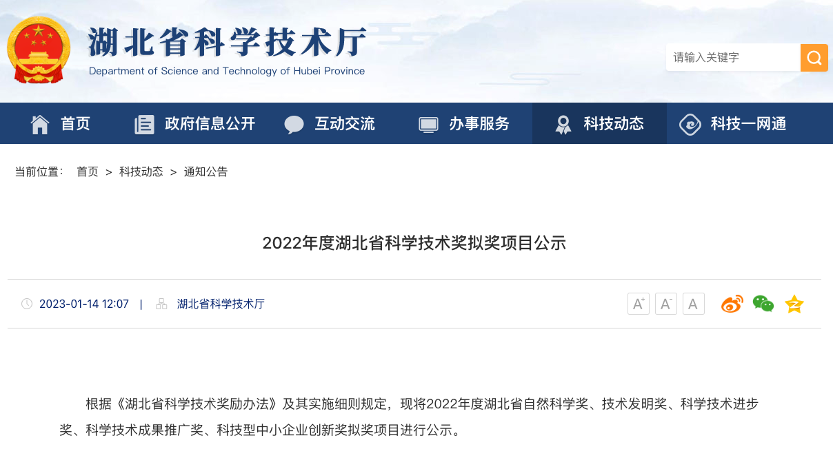 湖北省科学技术奖由湖北省人民政府设立,主要是为奖励在科学技术进步活动中做出突出贡献的公民和组织,分为自然科学奖、技术发明奖、科学技术进步奖、科学技术成果推广奖、科技型中小企业创新奖等,其中自然科学奖授予在基础研究和应用基础研究中,阐明自然现象、特征和规律、做出重大科学发现的公民和组织。2022年自然科学奖初评通过108项,经会评最终评出一等奖15项。