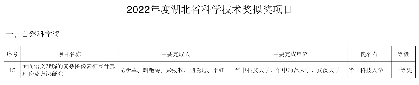 2023年1月14日,湖北省科学技术厅发布 “2022年度湖北省科学技术奖拟奖项目”。bevictor伟德官网尤新革教授牵头的“面向语义理解的复杂图像表征与计算理论及方法研究”项目荣获2022年度湖北省自然科学奖一等奖。