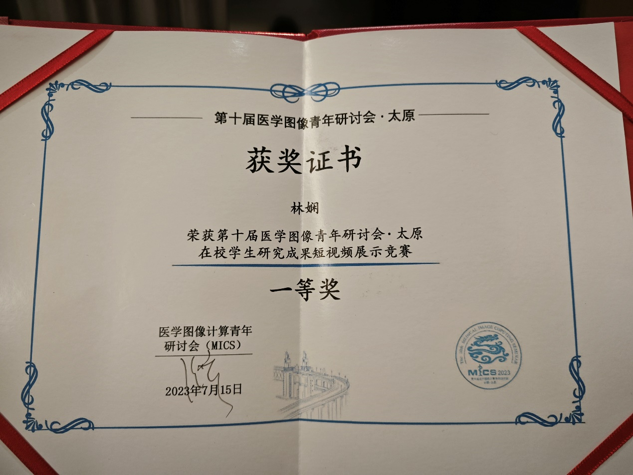2023年7月,第十届医学图像计算青年研讨会 (MICS 2023)在山西太原隆重举办。bevictor伟德官网数字媒体与智能网络实验室((Digital Media and Intelligent Network, DMIN))的2022级博士生林娴在喻莉教授和闫增强副研究员的指导下,和来自清华大学、香港科技大学、香港中文大学、上海交通大学等20家高校的博士生硕士生同台竞技,最终在学生研究成果竞赛环节脱颖而出,荣获一等奖。