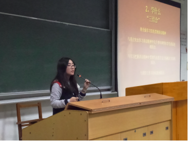 接下来,唐洁群同学向同学们重点介绍“长征精神”。她先简单介绍了长征历史,再讲解四个“伟大远征”精神的具体内涵,即理想信念的伟大远征精神,检验真理的伟大远征精神,唤醒民众的伟大远征精神,开创新局的伟大远征精神。唐洁群从“信仰的含义”入手,带领同学们走进心灵的世界,缅怀长征先烈,产生长征信仰的共鸣,提升自我境界。