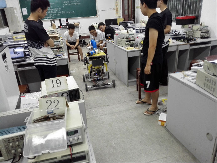 由于几天前的暴雨,之前的备战场地受到影响不能使用,STAR PRO战队将场地搬到了南一楼中227室。这里是华中大学子平时上电子电路实验课的地方,相对简陋的环境条件并没有对他们造成影响,小编刚到时,战队队员们正围着一个体形巨大的战车——英雄车进行讨论与调试。
