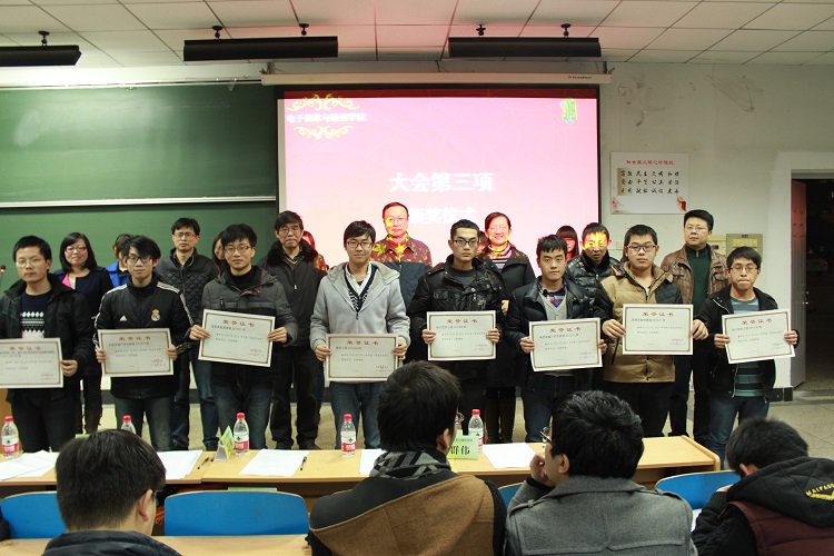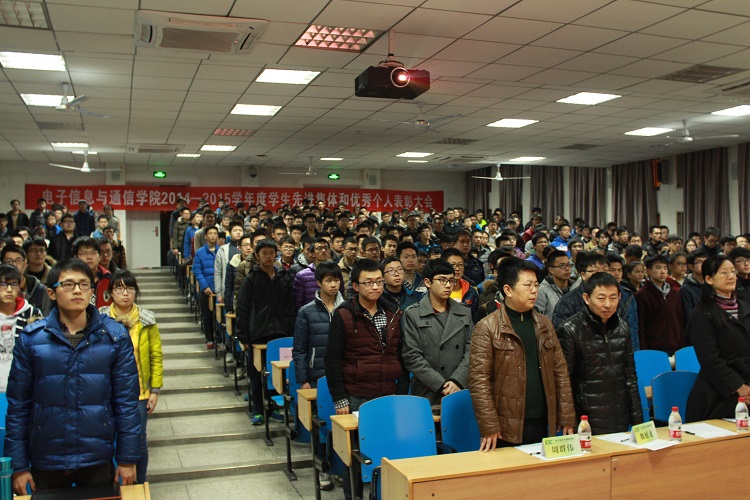 大会以一段学生工作风采展示的视频开场,展现了我院2014年学生工作在各方面取得的成果。嘹亮的国歌应声响起,全体师生起立致敬。在王殊院长宣读表彰决定后,2013-2014学年度华中科技大学“三好学生标兵”、“三好学生”、“优秀学生干部”、“优良学风班”的先进集体和优秀个人代表在热烈的掌声中依次上台领奖。而后获奖代表依次上台发言分享自己的学习、科研、生活等方面的经验。“国家奖学金”获奖代表卓越1101班丁文超同学展示了自己大学三年获得的科技、学习的有关奖项,着重分享了在科技创新活动中的经验感受。“三好学生标兵”获奖代表,提高1201班王洪阳同学总结了自己三年来的学习、生活经验,总结出“埋头做,抬头看”是成功的必备条件。从提高学习效率、开阔眼界与创业名人交流、科技创新等几个方面分享了自己的经验。“优秀寝室”获奖代表,电信1103班李晶玲同学讲述了自己寝室的一些成果,以及室友们一起奋斗的历程。“优良学风班”获奖代表谢存煌同学与大家分享了优良学风班的建设经验。用PPT展示了电信1104班四年取得的优秀成绩,并详细介绍了班级同学的去向。