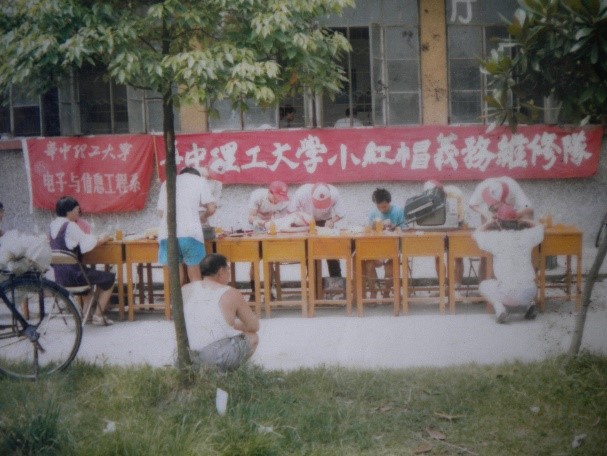 闫瑞尧(下面简称“答”):小红帽成立之初,是隶属于电信系二课部的一部分。当时条件有限,一些维修设备比较缺乏,队员们只有把电信系为我们准备的一间寝室(南二舍327)这作为团队的活动基地。“小红帽”成立后不久,就成为电信系的课外科技活动中心,拥有了自己的工作室。那时小红帽频繁活动于华工(现华中科技大学主校区)学生宿舍和喻园教师小区等地,维修物品大部分为电扇,受众主要为学校老师和校园周边的居民。说实话,在那段时间内,小红帽的条件是较为艰苦的,当初小红帽之所以能够坚持下来,全凭的是老一辈队员们那种不灭的热情以及对知识的追求,正因为有了他们的拼搏努力,才有了现在的、拥有着24年历史的小红帽。