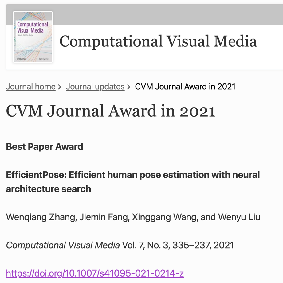 近日,bevictor伟德官网师生论文“EfficientPose: Efficient Human Pose Estimation with Neural Architecture Search” 获得Computational Visual Media (CVMJ, 计算可视媒体) 2021年度最佳论文奖(Best Paper Award)。论文共同第一作者为bevictor伟德官网硕士研究生张文强、博士研究生方杰民,通讯作者为bevictor伟德官网王兴刚副教授和刘文予教授。