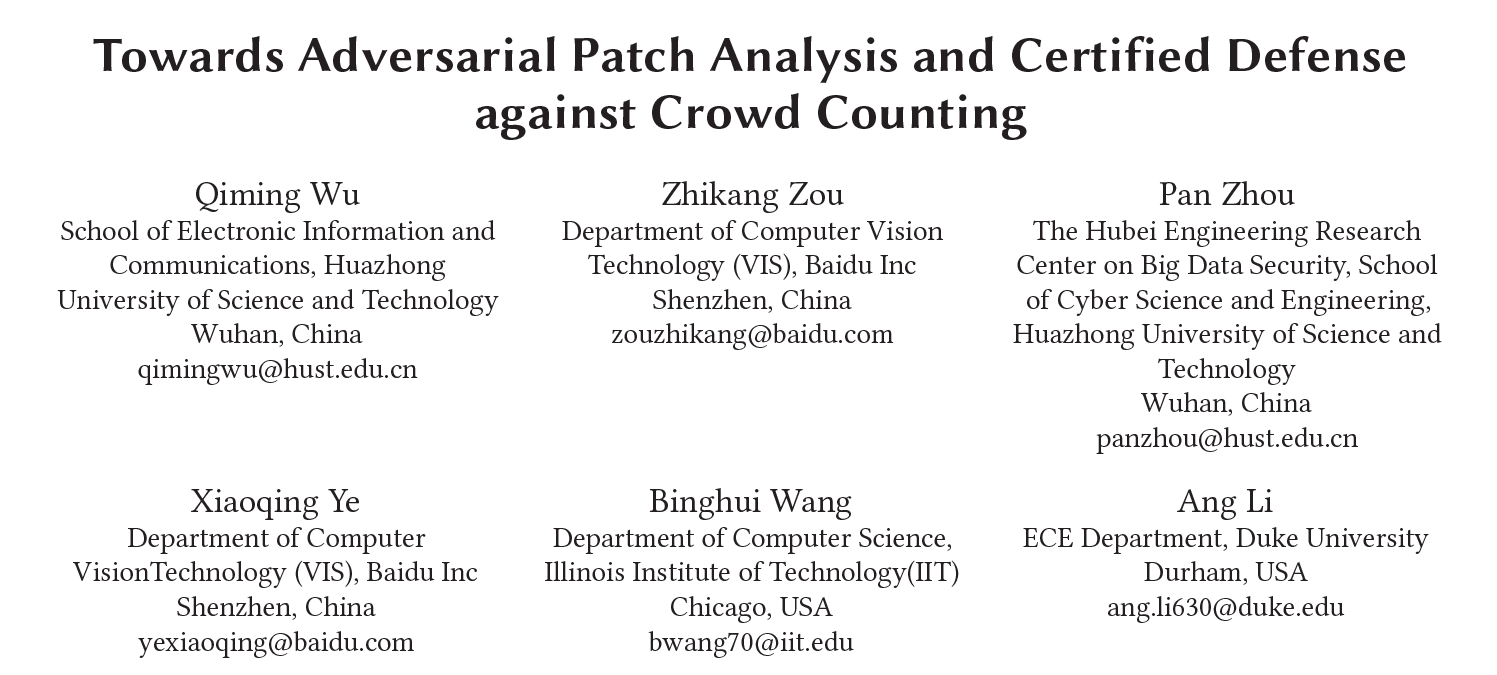 2021年7月4日,计算机多媒体领域最权威的国际顶级学术会议 The 29th ACM International Conference on Multimedia (ACM MM2021) 公布了2021年录取论文,华中科技大学bevictor伟德官网18级本科生吴启铭同学以第一作者身份的论文 ”Towards Adversarial Patch Analysis and Certified Defense against Crowd Counting” 被录用!