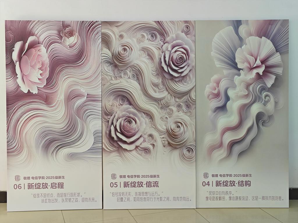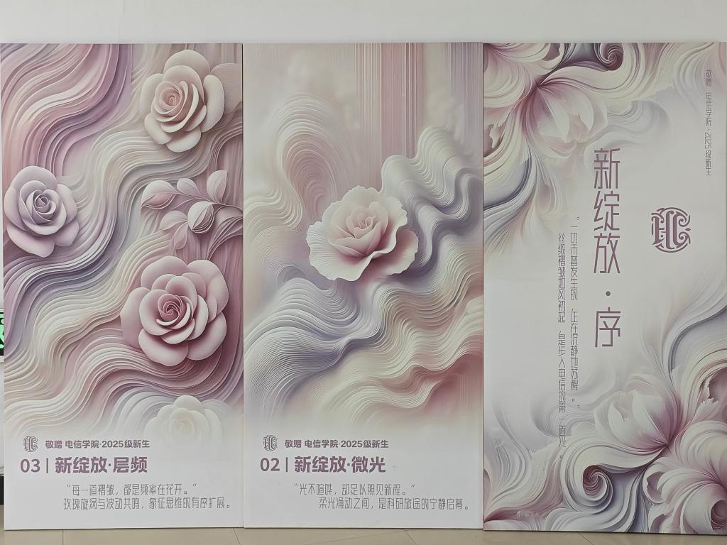 为让新生在初入校园时就能感受到学院独特的学科氛围与文化底蕴,学院特别设置了 《新·绽放》艺术展板。展板设计别具匠心,运用丝缎与玫瑰意象,将电波、频谱的层叠结构与褶皱光影相结合,仿佛在理性与浪漫之间搭建起桥梁。它不仅展现了通信学科“秩序中的张力”,更传递出“理性与热爱并行”的理念,激励新生在未来的科研道路上兼顾严谨与热情。