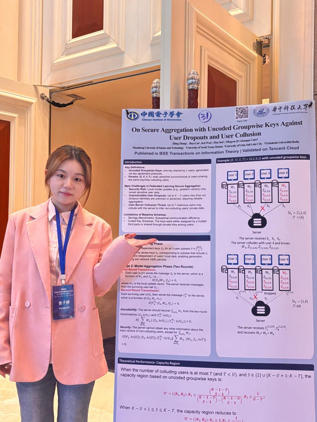 科研过程中,她也面临不少挑战。在研究安全聚合方案时,如何兼顾安全性、正确性与聚合效率是核心难题。初期方案虽能保证安全,却因密钥设计复杂导致聚合时间过长,多次实验均未达预期。但她未气馁,反复研读拆解问题。通过数十次调整分组密钥结构、模拟不同用户掉队场景,简化密钥生成流程,同时通过数学推导证明方案最优性。在撰写TIT期刊论文时,审稿人认为需要对容量域证明细节进行补充,她逐行核对推导过程,补充10余页辅助证明材料,终获录用。