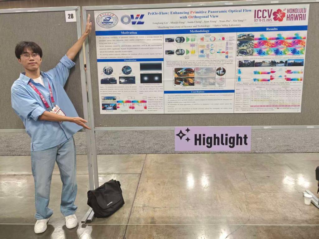 在首个科研工作中,他提出了基于正交视图畸变补偿的全景光流估计网络。该网络有效提升了两极高失真区域的光流估计精度,相关方法在所有全景光流数据集上均取得排名第一的成绩。在 ICCV 会议现场,多位领域学者主动与他进行交流,并对该成果给予一致高度评价。