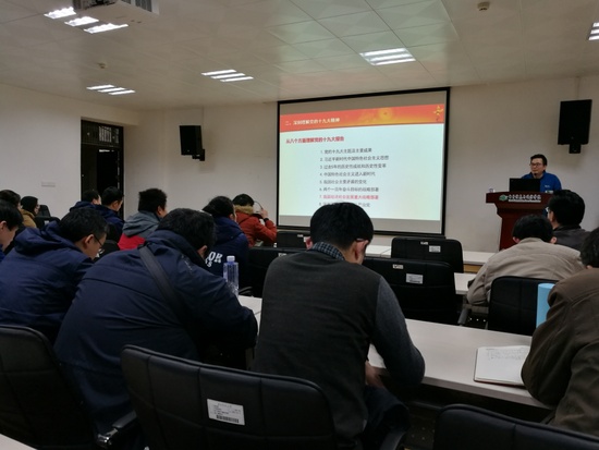 黄岭峻首先从党的十九大的盛况、大会的意义、大会的成果三个方面介绍了十九大概况,重点介绍了大会取得的重要政治成果、理论成果、实践成果。然后着重从十九大主题及主要成果、习近平新时代中国特色社会主义思想、过去5年的历史性成就和历史性变革、中国特色社会主义进入新时代、我国社会主要矛盾的变化、“两个一百年”奋斗目标、我国经济社会发展重大战略部署、坚定不移推进全面从严治党等8个方面阐述了如何深刻理解十九大精神。