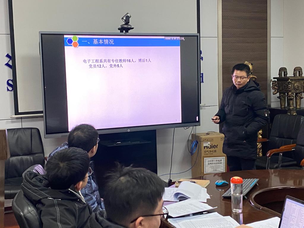 电子系党支部书记贺锋就支部活动开展情况、党员发展情况、思想政治工作、师德师风教育等方面做了汇报,电子系党支部在电子系搬迁方案细化落地、电子系生源问题解决方案、引进青年教师等方面发挥了重要的作用,未来支部将采取更加积极主动人才引进措施,进一步加强与学生党支部的共建。