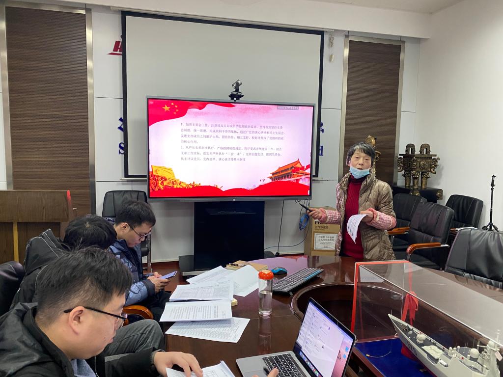 行政党支部书记戚建敏回顾了行政党支部过去一年的工作,她提及过去一年支部多次开展党史学习教育,加强理论学习,组织前往抗美援朝展馆参观学习,重视理论学习,党员的理论知识水平得到提升,在学生思想引导方面发挥了重要作用。同时她也谈到,受疫情影响,支部外出实践参观活动组织存在不足,接下来一年将组织实践参观特色当日,加强支部实践教育。