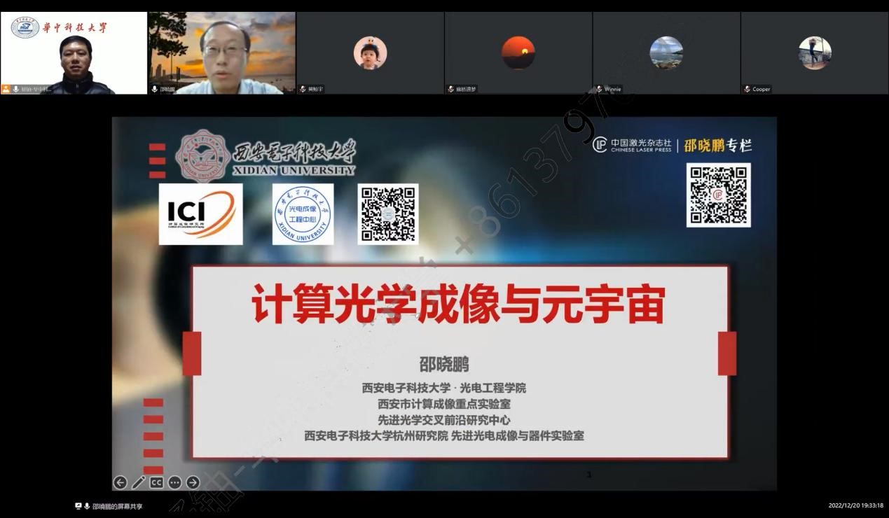 12月20日,我院“信通与智能大讲堂”第四期开讲。西安电子科技大学光电工程学院院长、西安计算成像重点实验室主任、中国光学工程学会常务理事邵晓鹏教授为我院师生带来了“计算光学成像与元宇宙”的线上学术报告。报告由副院长杨铀主持,学院师生、校外专家90余人参加了本次报告。