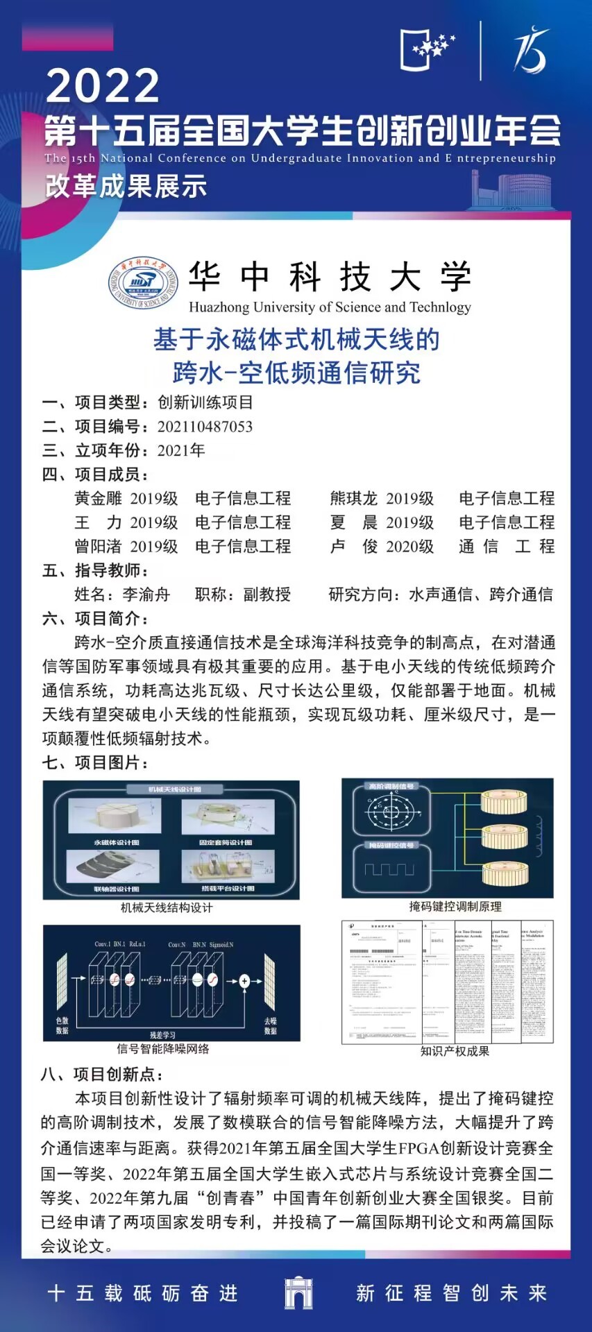本项目创新性设计了辐射频率可调的机械天线阵,提出了掩码键控的高阶调制技术,发展了数模联合的信号智能降噪方法,大幅提升了跨国一等奖、2022年第五届全国大学生嵌入式芯片与系统设计竞赛全国二等奖、2022年第九届“创青春”中国青年创新创业大赛全国银奖。目前已经申请了两项国家发明专利,并投稿了一篇国际期刊论文和两篇国际会议论文。