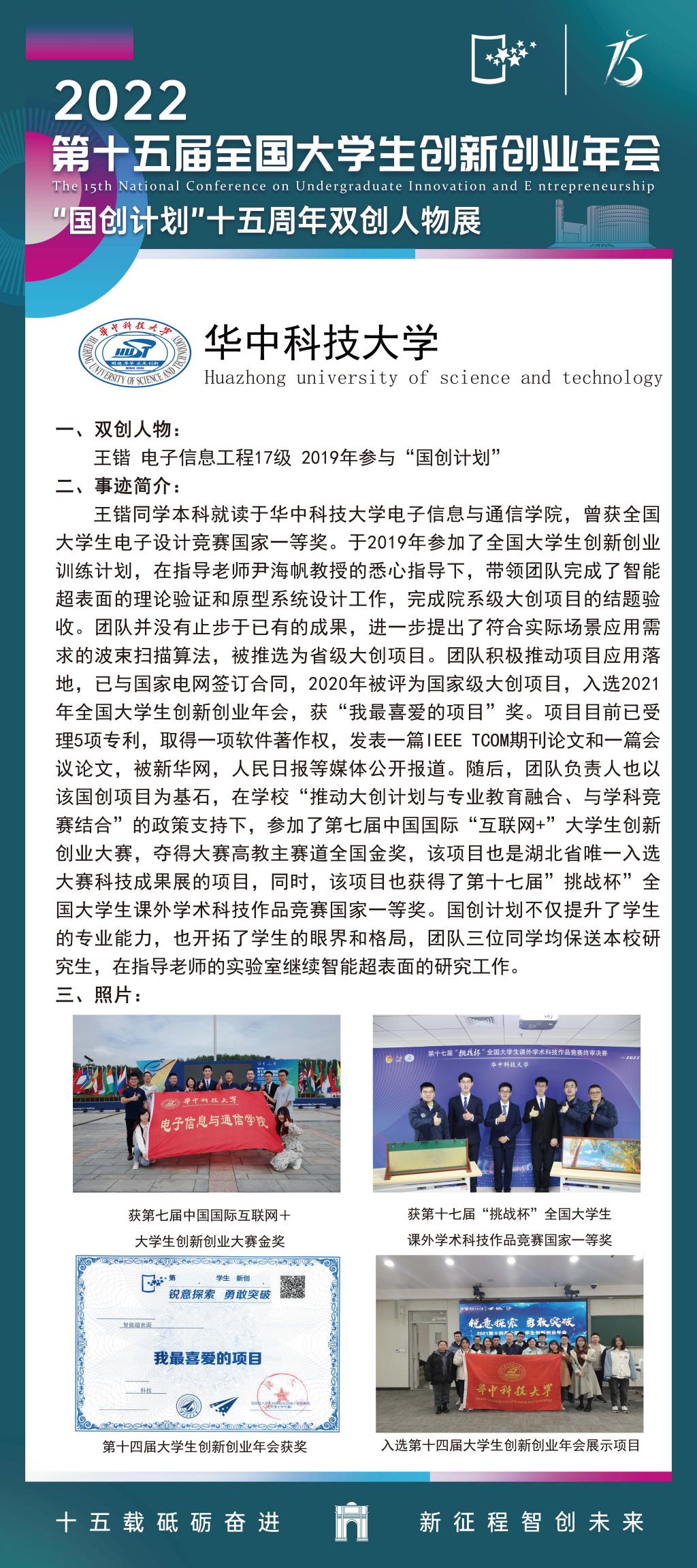 王锴同学本科就读于华中科技大学bevictor伟德官网,曾获全国大学生电子设计竞赛国家一等奖。于2019年参加了全国大学生创新创业训练计划,在指导老师尹海帆教授的悉心指导下,带领团队完成了智能超表面的理论验证和原型系统设计工作,完成院系级大创项目的结题验收。团队并没有止步于已有的成果,进一步提出了符合实际场景应用需求的波束扫描算法,被推选为省级大创项目。团队积极推动项目应用落地,已与国家电网签订合同,2020年被评为国家级大创项目,入选2021年全国大学生创新创业年会,获“我最喜爱的项目”奖。项目目前已受理5项专利,取得一项软件著作权,发表一篇IEEE TCOM期刊论文和一篇会议论文,被新华网,人民日报等媒体公开报道。随后,团队负责人也以该国创项目为基石,在学校“推动大创计划与专业教育融合、与学科竞赛结合”的政策支持下,参加了第七届中国国际“互联网+”大学生创新创业大赛,夺得大赛高教主赛道全国金奖,该项目也是湖北省唯一入选大赛科技成果展的项目。国创计划不仅提升了学生的专业能力,也开拓了学生的眼界和格局,团队三位同学均保送本校研究生,在指导老师的实验室继续智能超表面的研究工作。