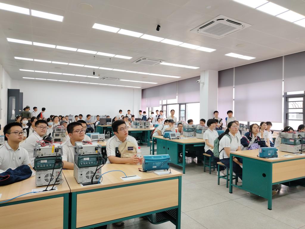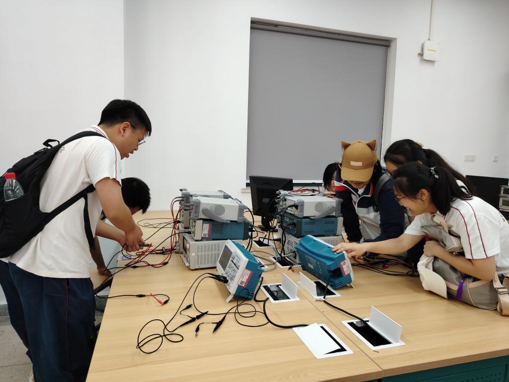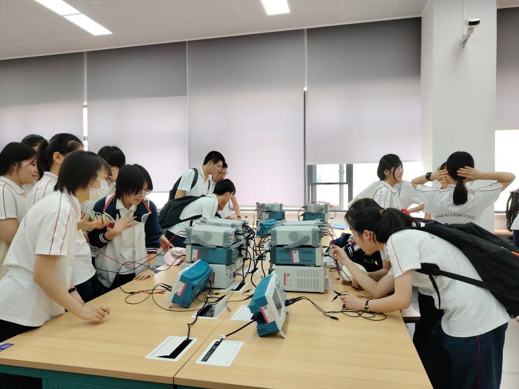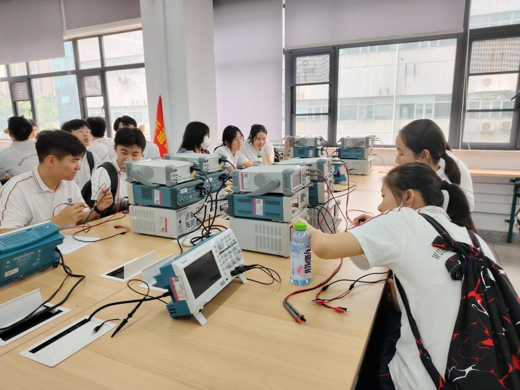 然后,夏景园工程师和朱盈盈工程师介绍实验室桌面的四件套仪器,并指导学生将仪器和测试线连接起来,进行设备调试,同学们从一开始不知如何下手,到后来调试出信号时展现出激动和欢欣的笑颜。夏景园工程师还展示了如何进行面包板布线,强调培养规范布局布线习惯。最后有兴趣的同学进入正在进行硬件课程设计的课堂,实地观察大学生的实验课程,提前体验大学课堂的自由、创新气氛。