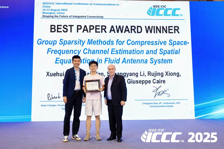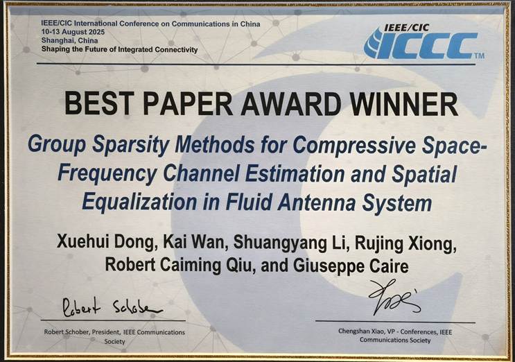 该获奖论文题为“Group Sparsity Methods for Compressive Space-Frequency Channel Estimation and Spatial Equalization in Fluid Antenna System”(流体天线系统中基于群稀疏的压缩空频信道估计与空间均衡方法),作者团队包括董学辉及其指导老师(万凯教授和邱才明教授)、来自德国柏林工业大学的李双洋博士后和Giuseppe Caire教授,以及我院毕业博士研究生熊儒菁博士。在8月12日晚的颁奖晚宴上,大会奖项委员会主席Tony Q.S. Quek教授与IEEE ComSoc当选主席Nelson Fonseca教授共同颁发了奖状。