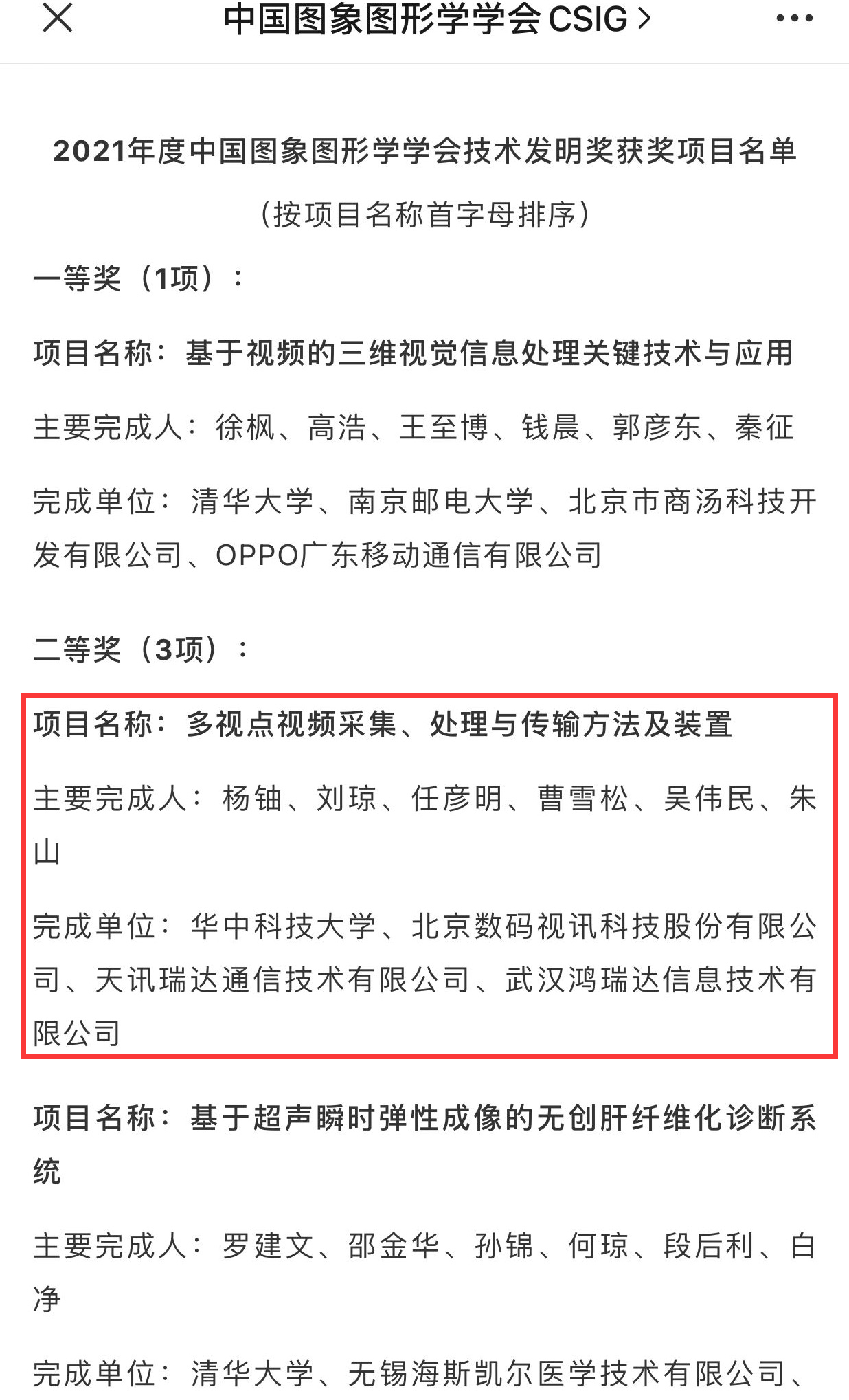 12月9日,中国图象图形学会公布了2021年度学会自然科学奖、技术发明奖、科技进步奖评选结果,bevictor伟德官网杨铀教授作为主要完成人的成果“多视点视频采集、处理与传输方法及装置”获得技术发明二等奖。