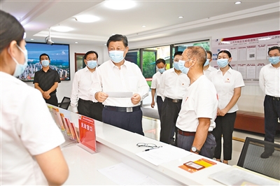 6月28日,中共中央总书记、国家主席、中央军委主席习近平在湖北省武汉市考察。这是28日下午,习近平在东湖高新区左岭街道智苑社区党群服务中心,向社区工作者了解党建引领基层社区治理及便民服务等情况,并同前来办事的老年人亲切交谈。